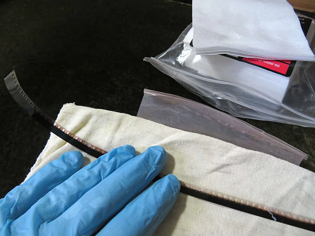 In unseren 13 Jahren Erfahrung haben wir festgestellt, dass alle Filme vom Reinigen profitieren – sogar Filme, die direkt aus dem Labor kommen! Viele Filme benötigen keine besondere Pflege – eine sorgfältige Handreinigung reicht aus. Andere Filme, obwohl selten, erfordern eine teure Filmlösung namens "FilmRenew" (nicht hier gezeigt).